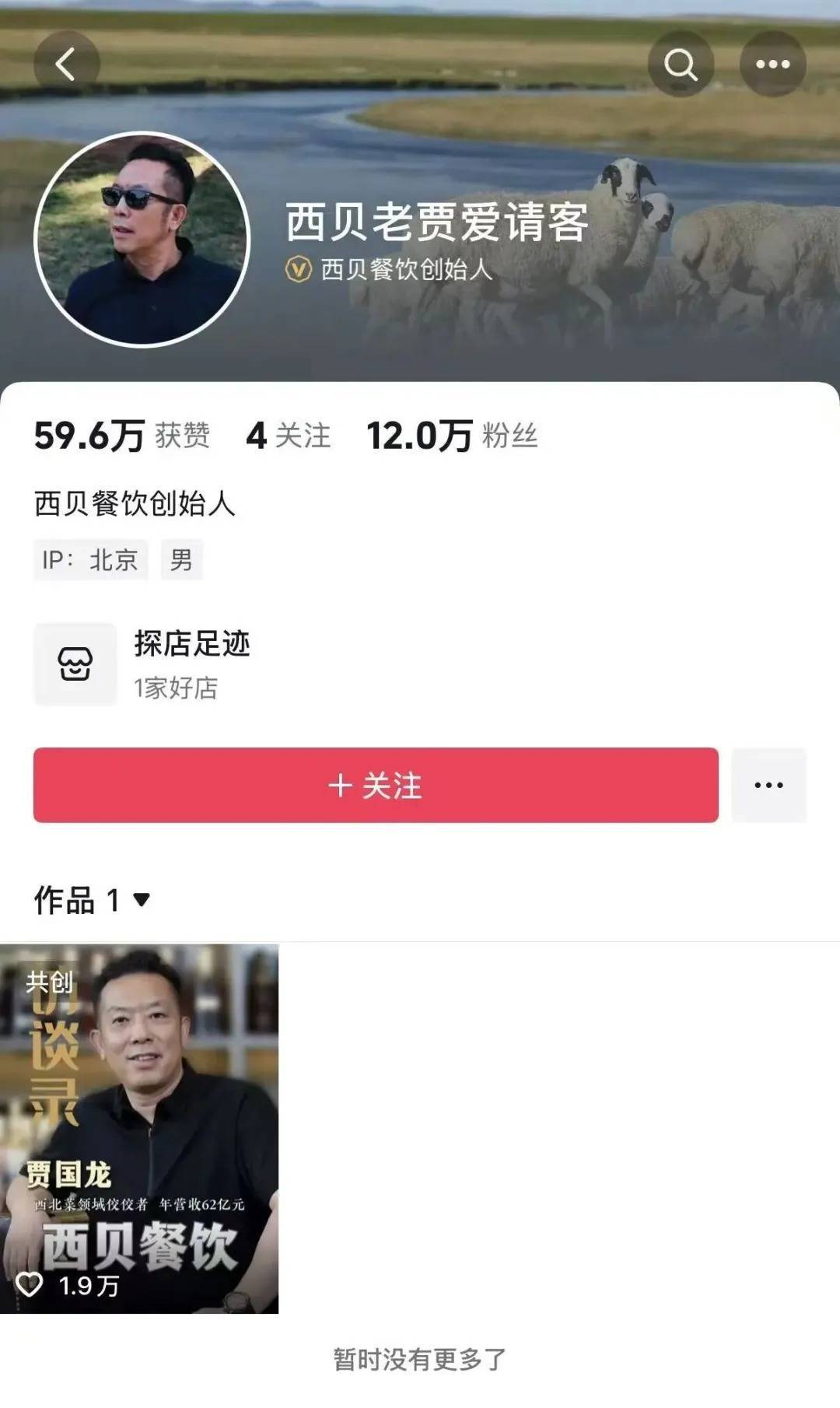 据此前报道,9月28日,记者搜索发现,西贝餐饮创始人贾国龙的抖音目前仅保留一条公开视频作品,发布于2024年9月30日,该视频内容为“大熊专访贾国龙”,涉及西贝餐饮成长史,称西贝是西北菜领域佼佼者、年营收达62亿。